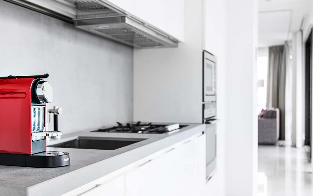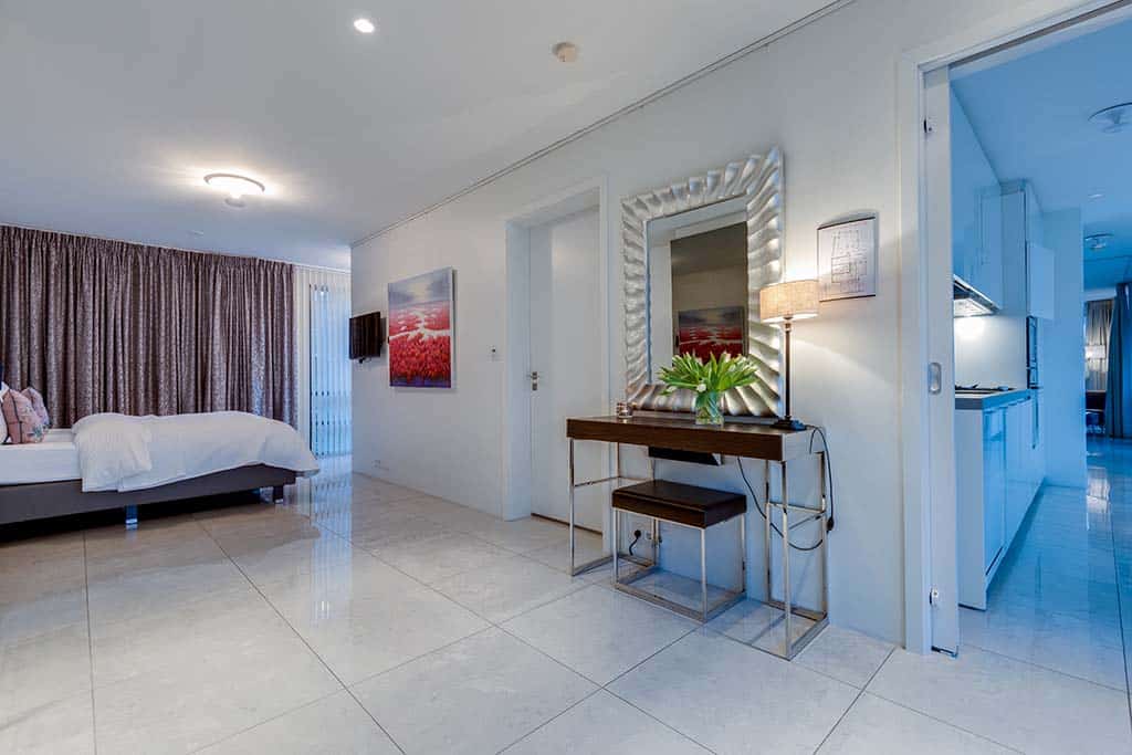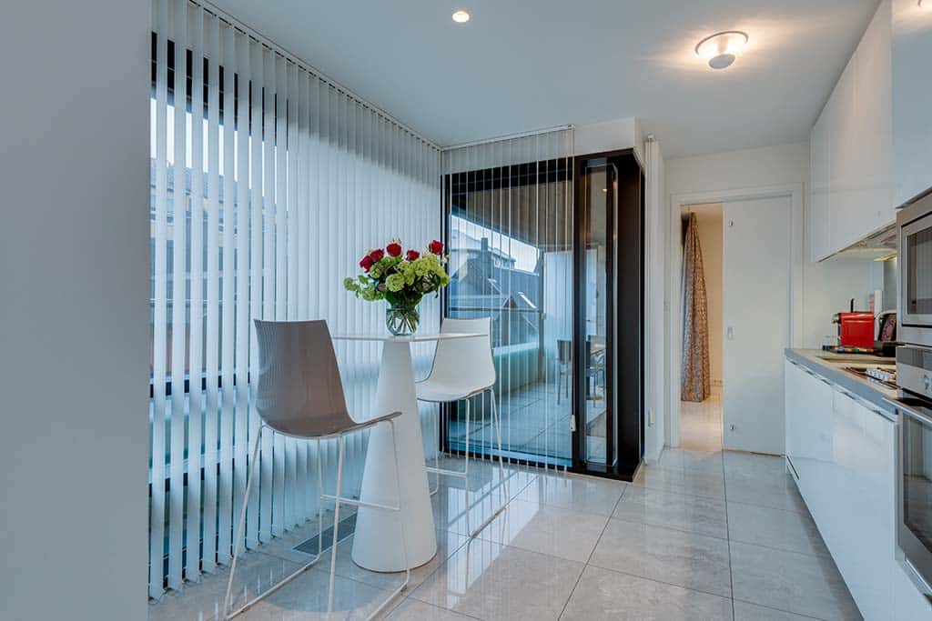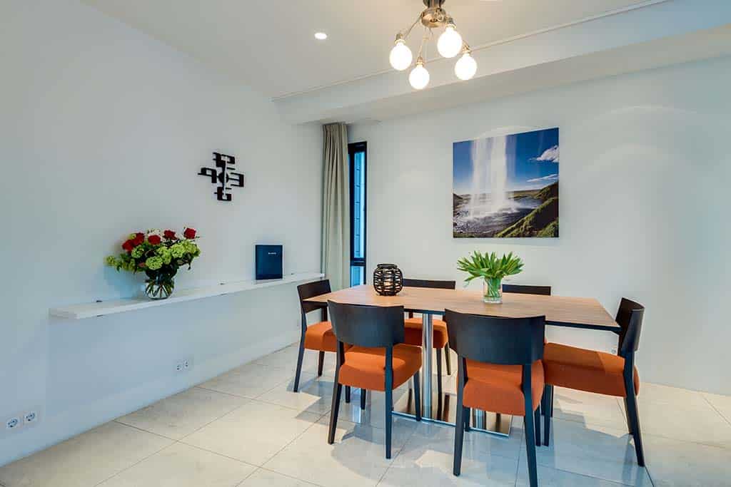 Our Deluxe Suites can accommodate up to five guests. These modern apartments come with a comfortable kingsize bed and a double and a roll away bed in the living room. In contrast to the Standard Suites, the 115 m² Deluxe Suites have private lift access and extra amenities, such as a washing machine and tumble dryer. Complete with a luxurious bedroom, high-end kitchen with Nespresso coffee machine, dining area, terrace and complimentary WiFi, these suites make for a perfect luxury break. It is possible to connect the Deluxe Suites to a Standard Suite via the terrace balcony.